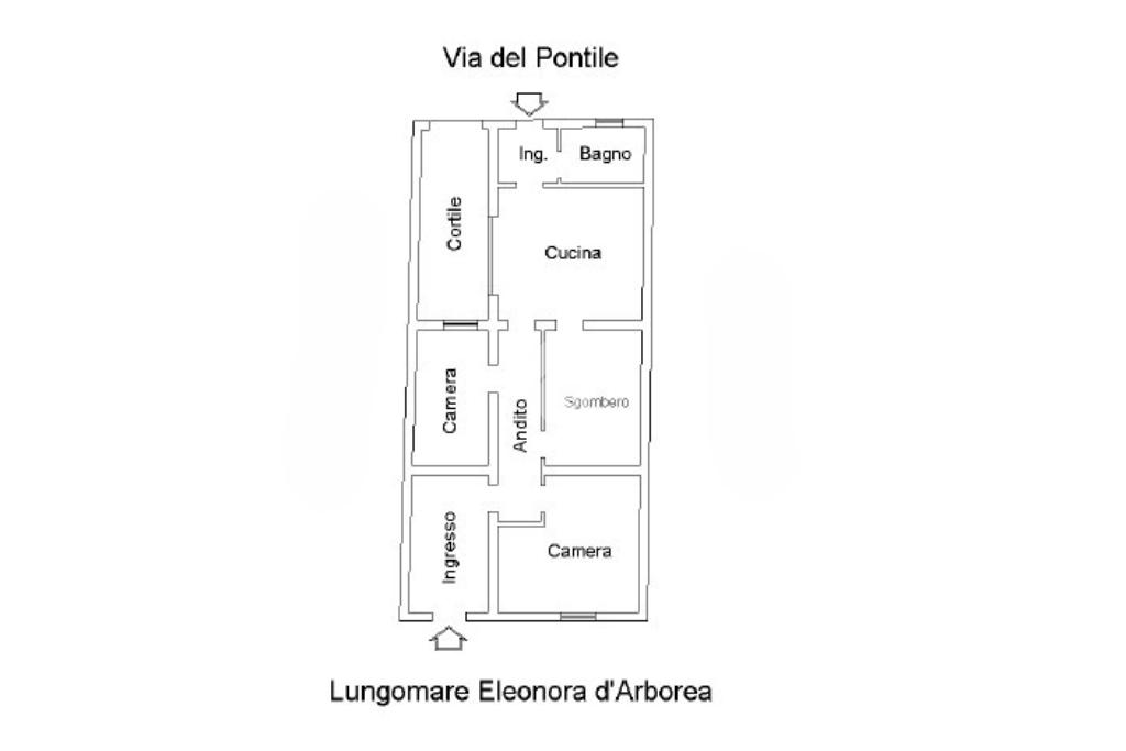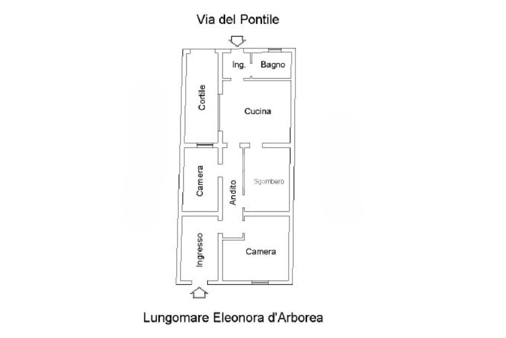 L’immobile dispone di un primo accesso dal Lungomare Eleonora d’Arborea che conduce a un disimpegno dal quale si accede a tutti gli ambienti. La zona giorno è composta da un soggiorno con angolo cottura, con uscita diretta sul cortile interno, ideale come spazio riservato e vivibile.